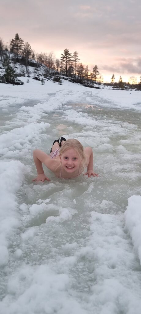 Lise Tonstad tar påskebadet på Øksendalsheie💛Foto: Siv Olaug Tonstad