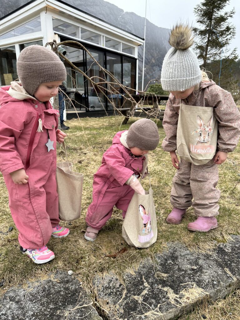 Saga,Iben og Henriette på påskegg jakt. Foto: Terese Moen
