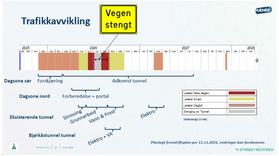 Et av de nødvendige tiltakene som må til for å kunne gjennomføre prosjektet, blir å stenge fv42 helt i en fireukers periode på sommeren. Hæhre redegjorde for når dette kan skje og har signalisert at perioden vil bli lagt til juli.