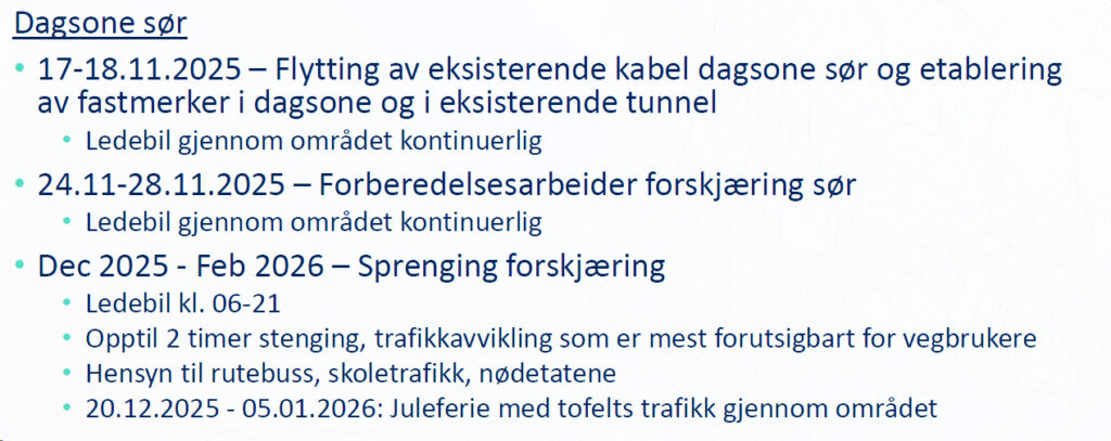 I tillegg skal det omlegges høyspent og fiberkabel ved steindeponiet på Haughom i perioden 24. november og til 19. desember. Her vil det bli lysregulering på strekningen.