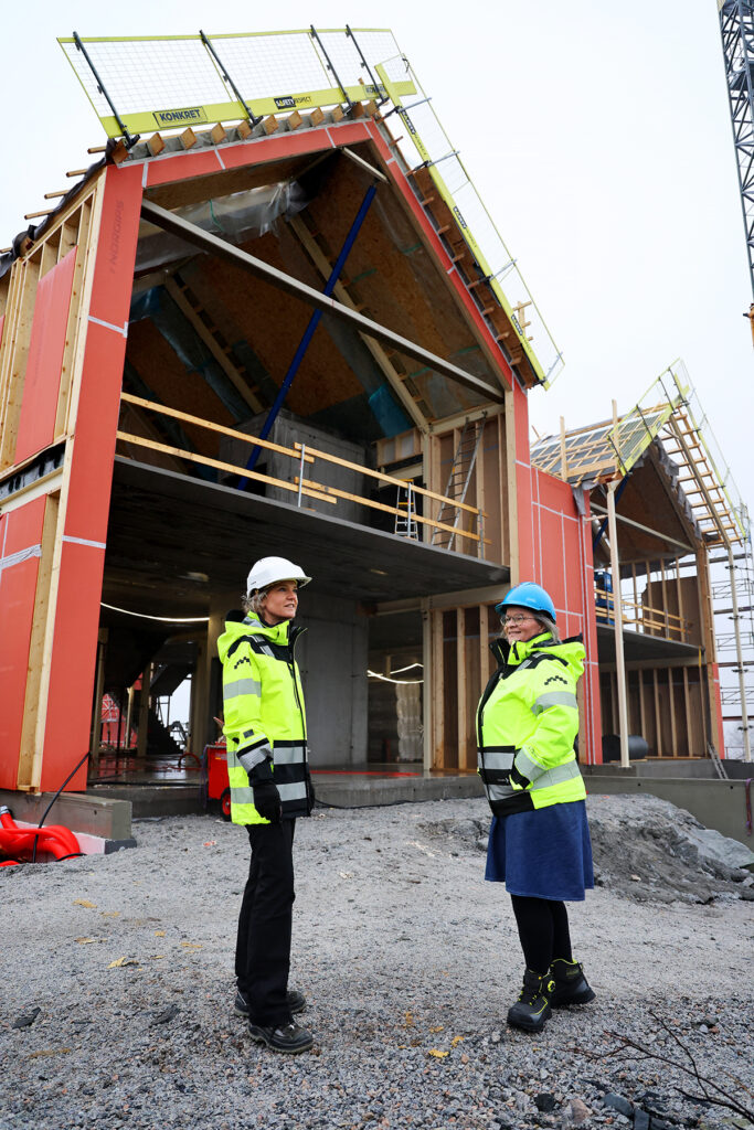 Prosjektleder Birgitte Bethuelsen og kommunedirektør Aud Sunniva Fuhr foran Kraftvitensenteret, et av om lag 40 pågående prosjekt i kommunen.