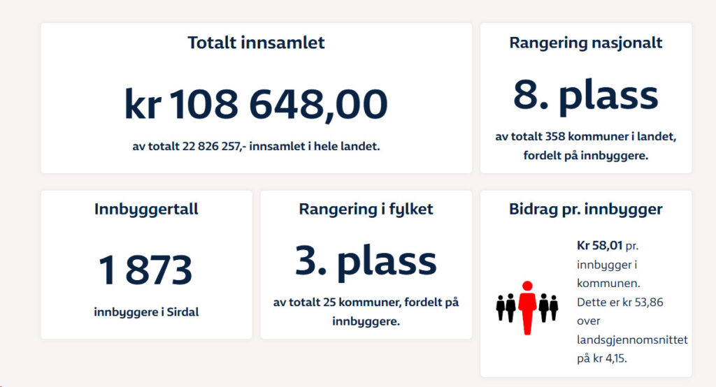 Selv om aksjonsdagen først er søndag 19. oktober har givergleden vært fullt tilstede i Sirdal i flere uker allerede. Oversikten over bidrag gjennom Giverstafetten viser at det tirsdag morgen er kommet inn hele 108.648,- kroner så langt. De rause gavene har ført at Sirdal er på 8. plass av alle landets kommuner.