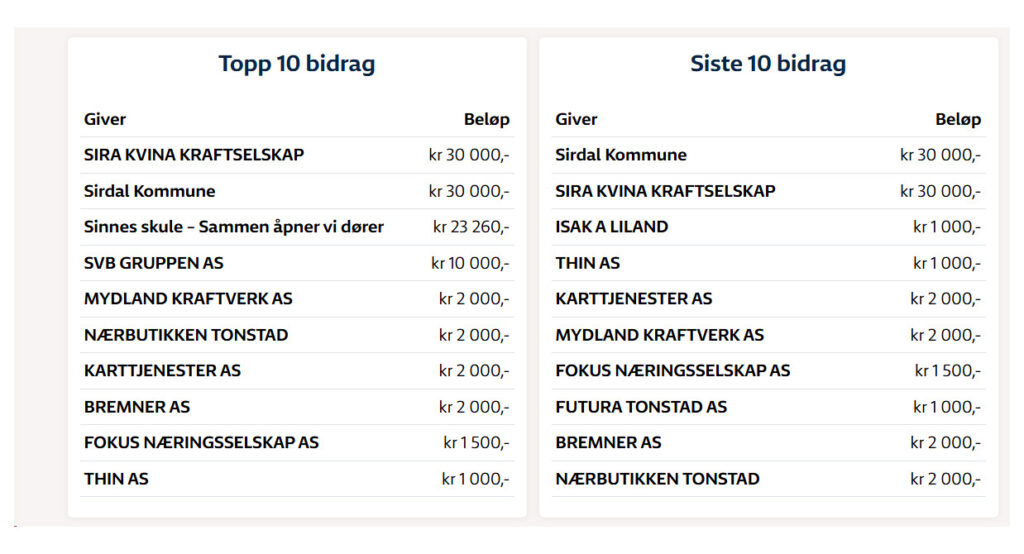 Giveroversikten viser at det er stor spredning blant giverne i Sirdal. Oversikten inneholder alt fra de minste selskapene, til store donasjoner som fra Sira Kvina Kraftselskap og Sirdal kommune. Både offentlige og private initiativ er kommet inn så langt.