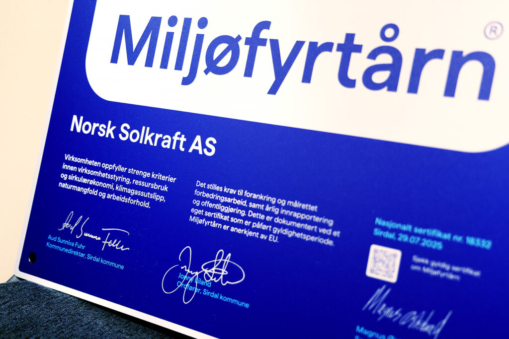 Selskapet Norsk Solkraft AS i Sirdal er nettopp blitt Miljøfyrtårn sertifisert. Denne uken overrakte ordfører det synlige beviset på bedriftens miljøprofil.