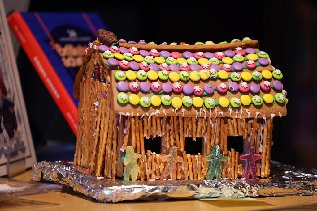 Pepperkakehuset pyntet med Nonstop på taket er laget av Filip Dorga, Hanne Dorga, Emil Dorga, Theoline Jensen, Ingrid Lindeland, Åshild Lindeland og Solveig Lindeland.
