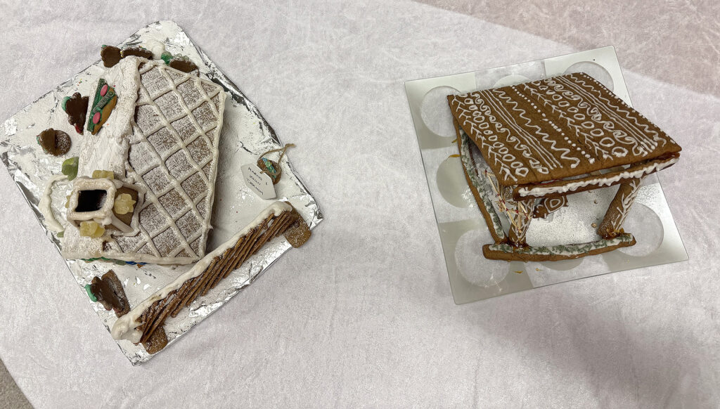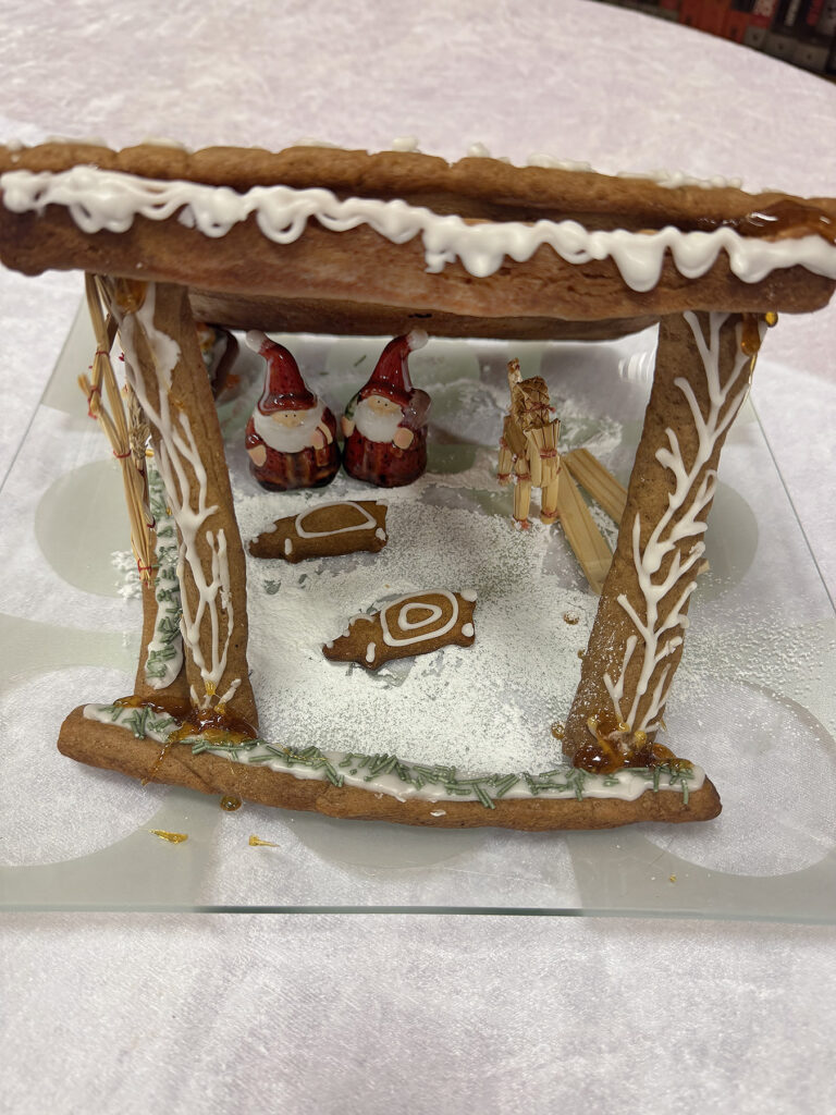 To av de flotte bidragene til Pepperkakebygdene som er levert inn på Sinnes. Det er Marius og Johan Tjørhom som har laget huset og Karoline Strømsvåg som har laget gapahuken.