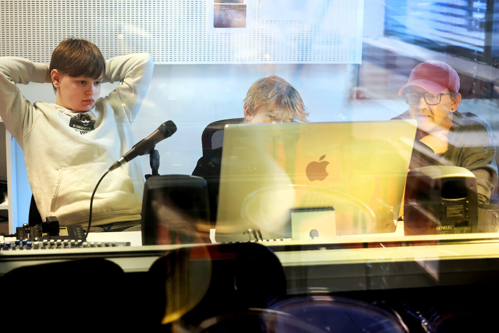 f.v. Ole Andre Ousdal og Damien Nickolai Hognestad Lund sammen med lærer Eivind K. Sætre i studioet. Gutten er i gang med å produsere egen låt.