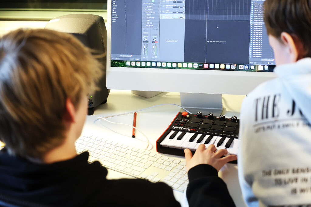 Denne skoledagen har elevene Damien Nickolai Hognestad Lund og Ole Andre Ousdal studioet for seg selv. De er midt i arbeidet med ny låt som de selv har produsert i proffverktøyet Logic Pro. Arbeidet er ikke ferdig, og de unge elev-artistene er ikke helt fornøyd enda.