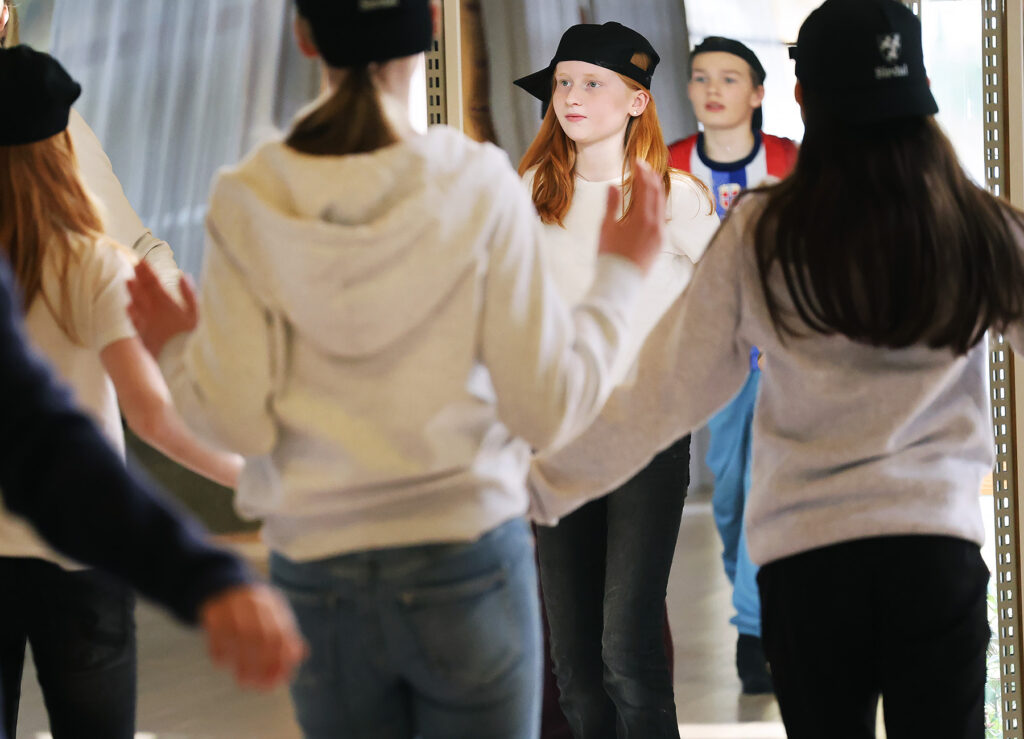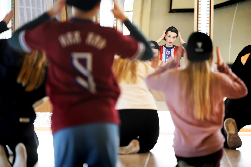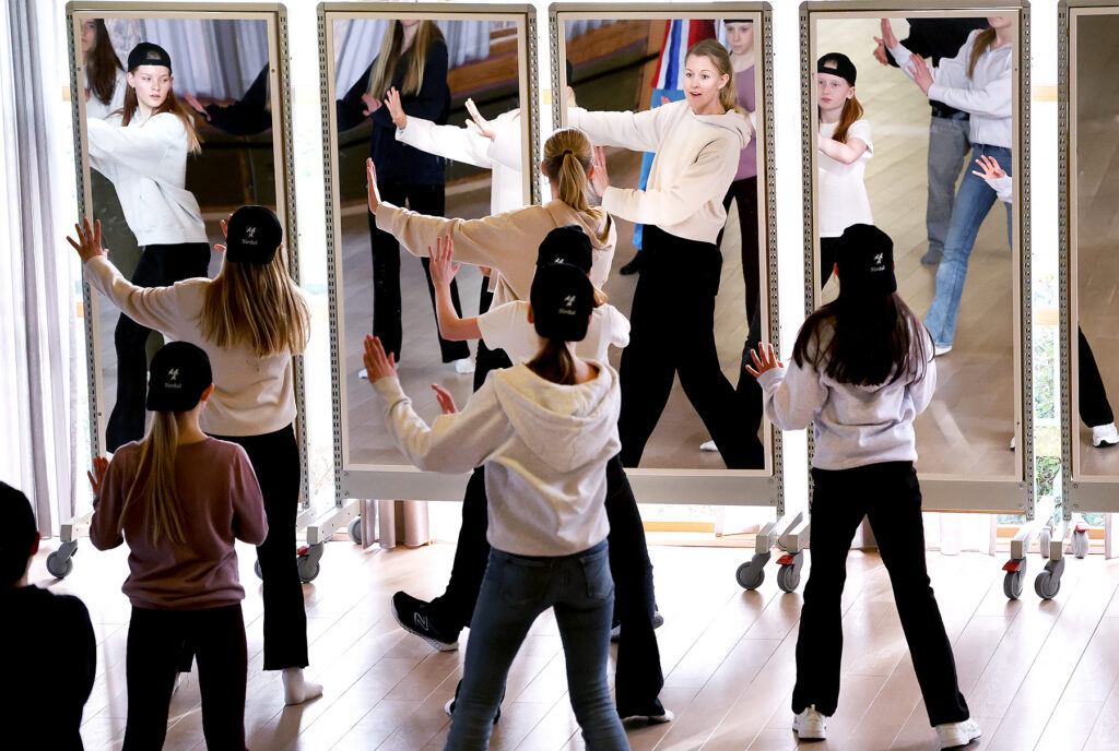 Et av de selvfølgelige kursene som Kulturskolen tilbyr, er dans. Denne øvelsesdagen er en gruppe fra 7. klasse i gang med koreografiøvelser i Festsalen på Kulturhuset. Fem store speil er satt opp og som gir elevene mulighet til å se hva som gjøres rett og hva som må endres på for at nummeret skal sitte perfekt.
