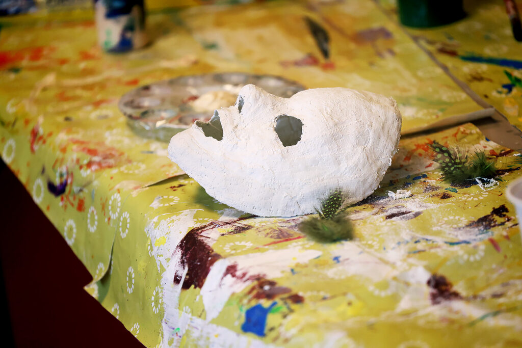 Elevene på kunstgruppa lærer å arbeide med ulike materialer og uttrykk. Denne dagene var det gipsmasker som ble laget og senere malt i farger.