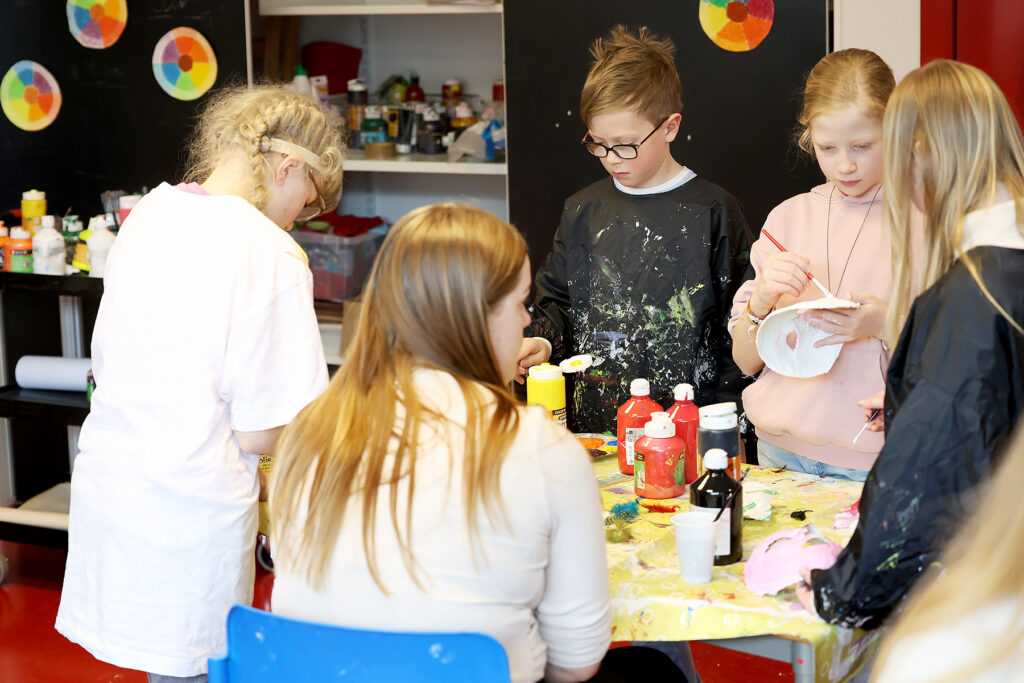 På kunst-og håndverkssalen har lærer Dagny Iren Tonstad Torsteinbø ansvaret for fjerde og sjetteklassinger fullt i gang med å skape fargerike og fantasifulle gipsmasker.
