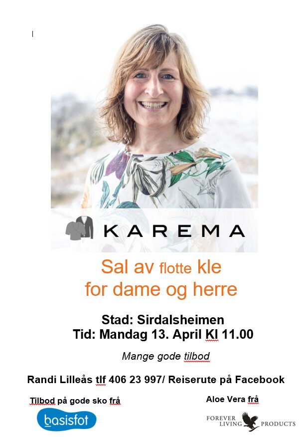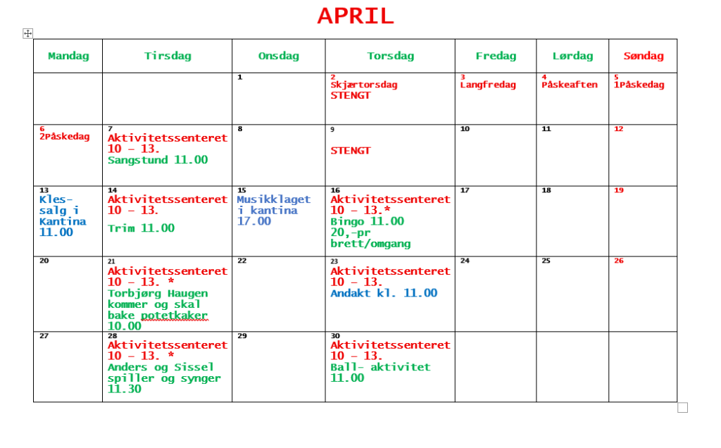 Slik blir april på Aktivitetssenteret Aktivitetssenteret på Sirdalsheimen har planen for april klar. Få også med deg besøket til Karema hvor det blir salg av dame- og herreklær.