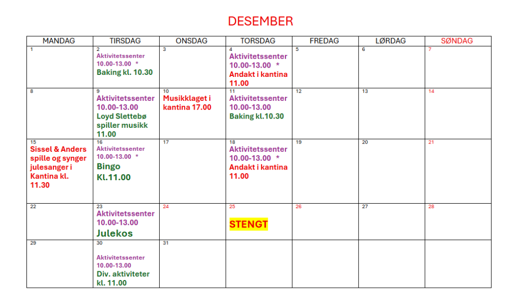 Aktivitetskafeen på Sirdalsheimen byr på flere hyggelige sammenkomster i desember. Her kan du delta på sang, musikk, bingo, baking og andakter i vinterens første måned.