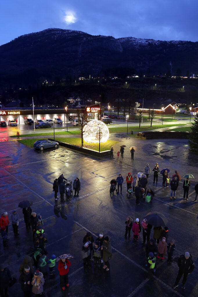 I år som ifjor ble tenningen av julegranen utfordret av dårlig vær. Det gjorde likevel ingenting for å ødelegge stemningen for de vel 150 fremmøtte søndag.
