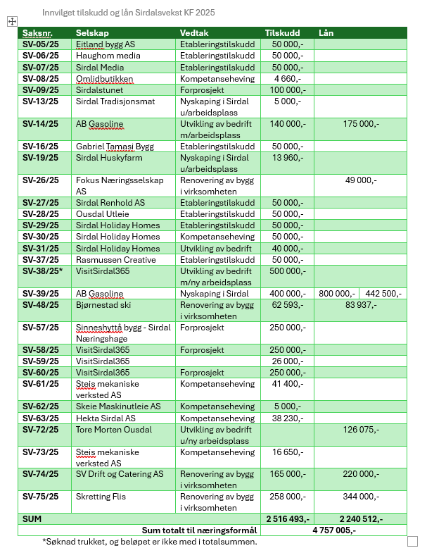 Se oversikten: Tildelinger og lån fra Sirdalsvekst KF i 2025